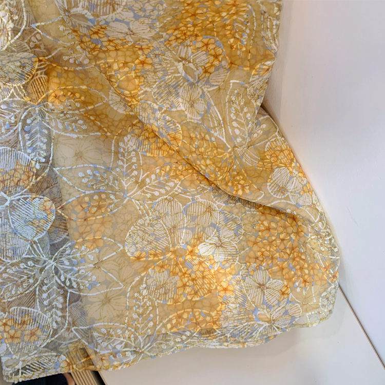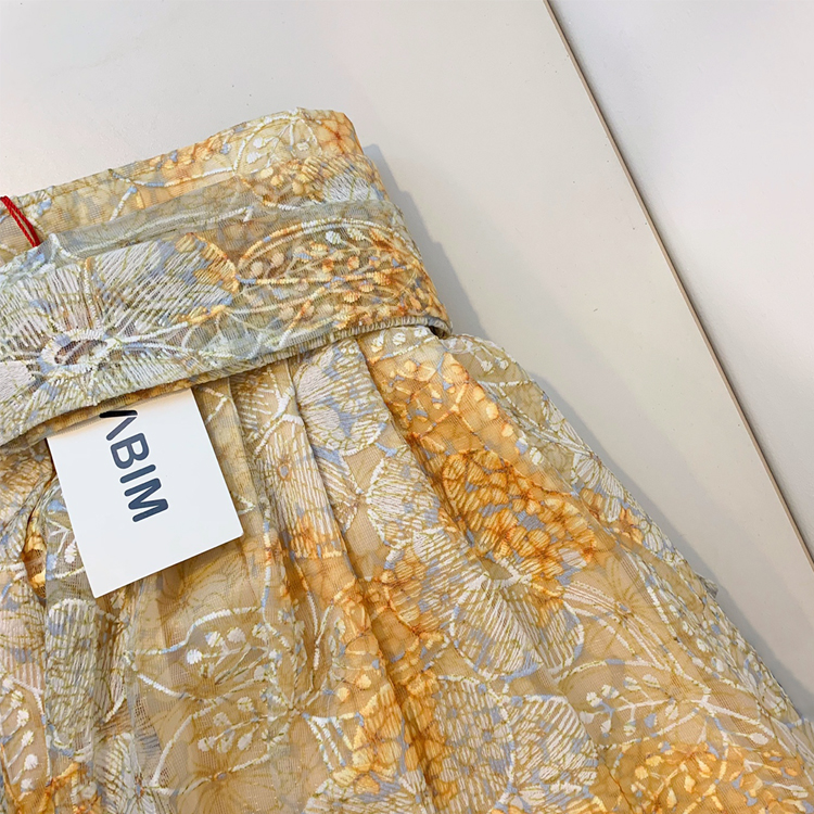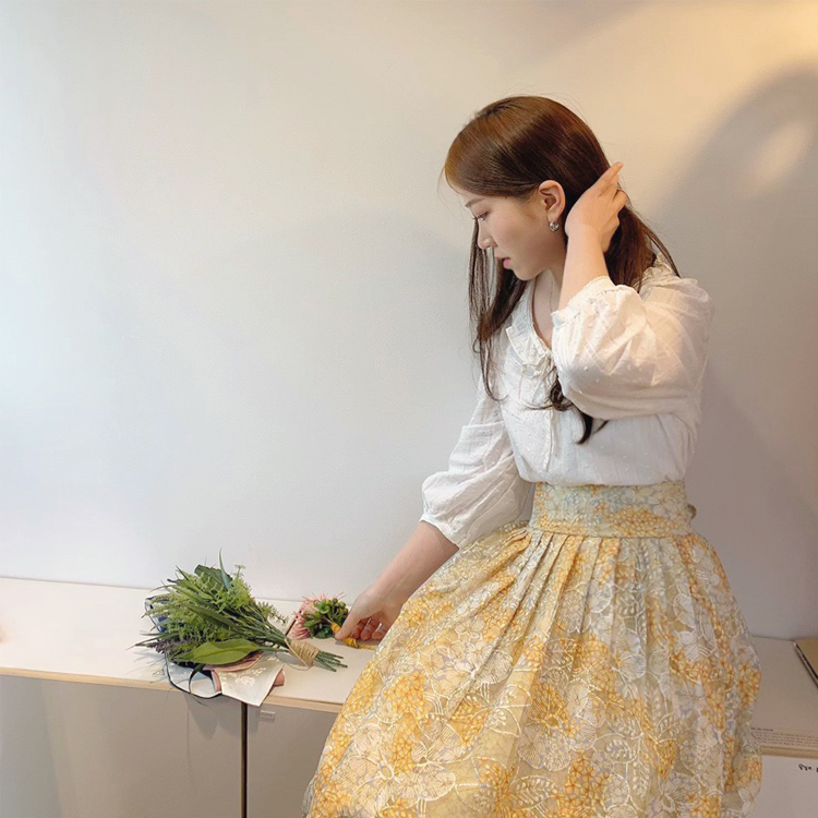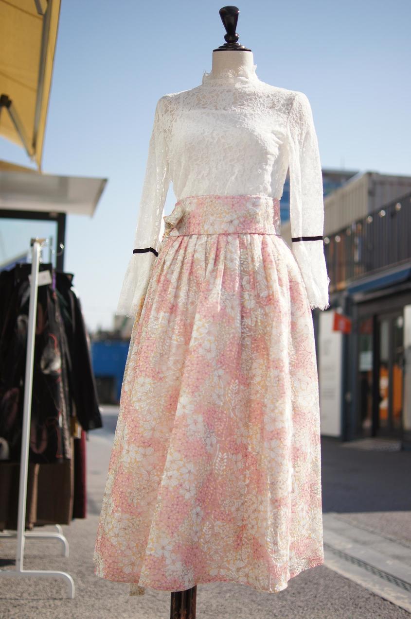 샤원단 위에 프린팅과 자수로 연출한 고급레이스의 허리치마 입니다.