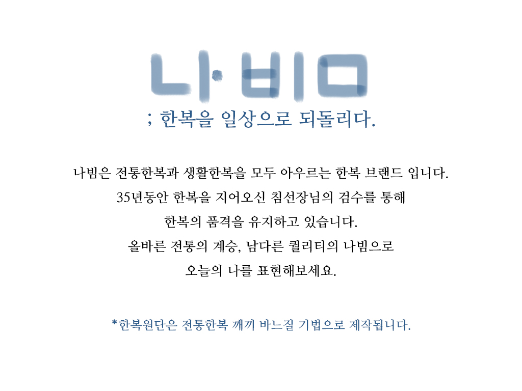 - 나빔 생활한복을 더 오래 입는 법 - 세탁법 - 나빔 제품은 모두 드라이클리닝을 권장합니다. - 부득이하게 물세탁 시, 미지근한 물에 중성세제를 풀고 조물조물 손세탁하여 탈탈 털어 그늘에 건조해 주시기 바랍니다. - 부분적인 얼룩은 물티슈 또는 세제로 눌러 지우시길 바랍니다. - 비틀어 짜거나, 원단을 비비지 마세요. - 세탁기나 건조기 사용하지 마세요.